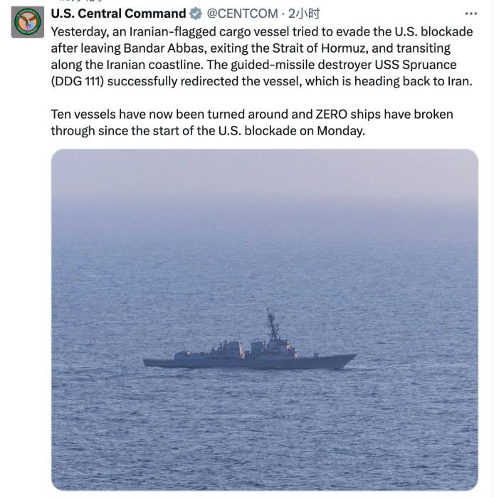 美军中央司令部表示,自13日美军开始实施封锁以来,已有10艘船只被勒令返航,尚无船只突破封锁。