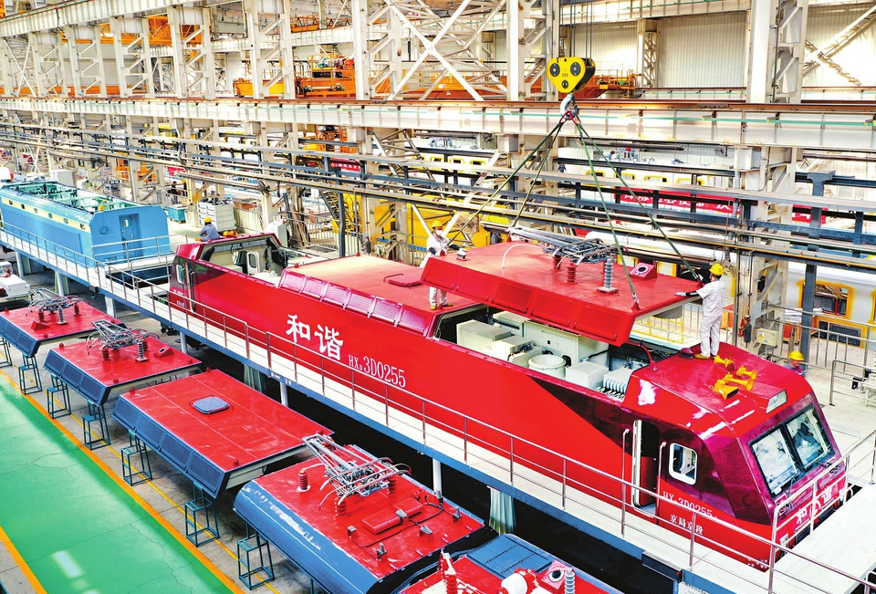 5月20日,在中车太原公司和谐型机车总组装生产线,工人们正在吊装电力机车顶盖。今年以来,中车太原公司克服疫情对生产的影响,强化跟踪工序进度,全面排查整治安全质量薄弱环节,确保各个工序安全高效、工艺质量可靠。目前,公司已实现电力机车检修产品交直流并举的重大跨越。(记者刘通摄)