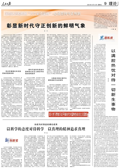 以科学的态度对待科学、以真理的精神追求真理,是中国共产党人对待科学真理的一贯立场和鲜明态度。推进马克思主义中国化时代化是一个追求真理、揭示真理、笃行真理的过程。100多年来,我们党牢牢把握真理、守住正道,把马克思主义基本原理同中国具体实际相结合、同中华优秀传统文化相结合,将其灵活地而不是刻板地、辩证地而不是教条地运用于实践,不断推进马克思主义中国化时代化,用发展着的马克思主义指导我国革命、建设、改革事业,取得举世瞩目的伟大成就。党的十八大以来,以习近平同志为核心的党中央坚持解放思想、实事求是、守正创新,既坚持马克思主义基本原理和科学社会主义基本原则,又与时俱进发展马克思主义,着眼生动鲜活的新实践新发展不断作出新的理论创新创造,赋予马克思主义鲜明的实践特色、民族特色、时代特色,创立了习近平新时代中国特色社会主义思想。这一重要思想站在真理和道义的制高点上,以全新的视野深化对共产党执政规律、社会主义建设规律、人类社会发展规律的认识,以原创性理论贡献标注了马克思主义发展的新高度,体现科学社会主义理论逻辑和中国社会发展历史逻辑的辩证统一,彰显守正创新的理论品格和鲜明特质,实现了马克思主义中国化时代化新的飞跃。