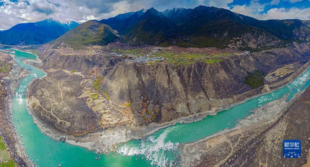 鸟瞰雅鲁藏布江畔的索松村(无人机拼接照片,4月5日摄)。新华社记者 姜帆 摄