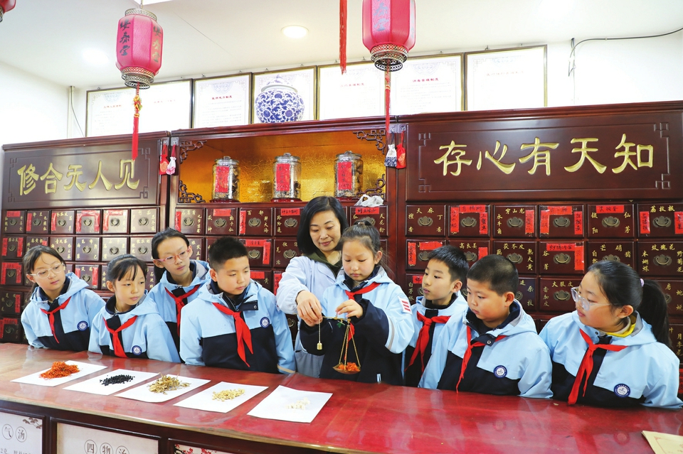 12月7日,阳泉市城区小阳泉北社区党委联合阳泉市实验小学,开展了“学习草药知识、感受中医魅力”课外实践活动。孩子们来到药店,通过识别中草药、称量、加工中草药材等具体活动,近距离体验中医药传统文化特色,感受中医药魅力。图为孩子们在药剂师的指导下称量中草药。(张春林摄)