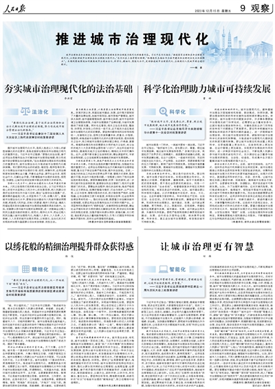 城市治理体系和治理能力现代化是国家治理体系和治理能力现代化的重要内容。习近平总书记指出:“推进国家治理体系和治理能力现代化,必须抓好城市治理体系和治理能力现代化。”总书记在上海考察时强调:“把增进民生福祉作为城市建设和治理的出发点和落脚点”。本期观察版围绕如何提高城市治理法治化、科学化、精细化、智能化水平,更好推进城市治理现代化、全面践行人民城市理念进行探讨。