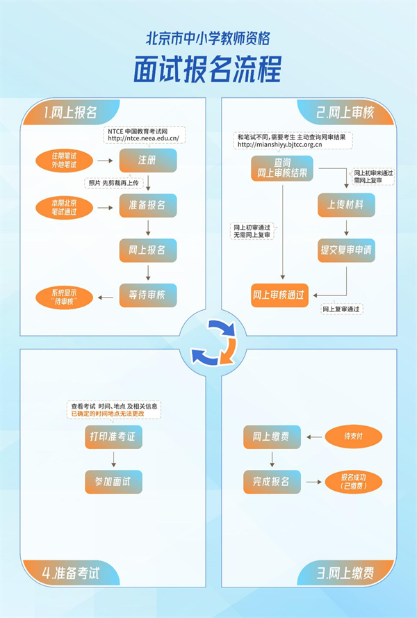 报考面试流程为:网上报名→网上审核→网上缴费→查询准考证→参加面试→查询成绩。