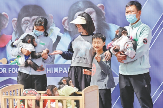 16日,北京野生动物园在萌宝幼儿园户外展区组织“明猩见面会”活动,邀约忠实粉丝与四只小黑猩猩互动合影。本报记者 邓伟摄