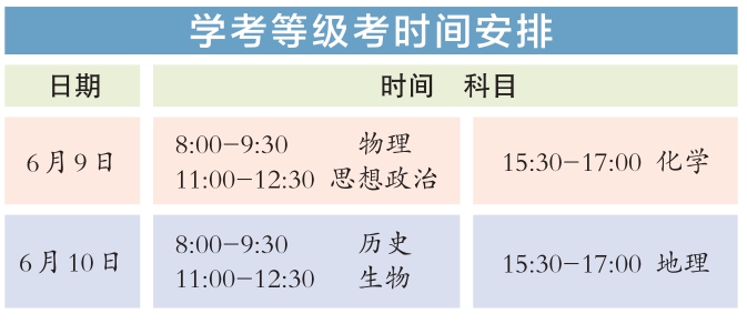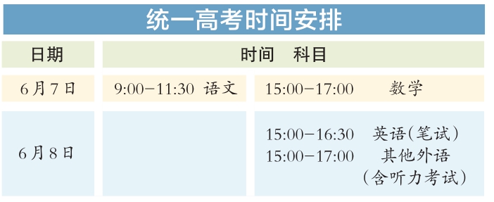 今年统一高考考试科目为语文、数学、外语3门,满分均为150分。其中,英语听说考试满分50分,其他外语(非英语)听力考试满分30分,两次听说(听力)考试的最高成绩与其他部分试题成绩一同组成外语科目成绩计入高考总分。学考等级考科目为思想政治、历史、地理、物理、化学、生物6门,由考生自主选择3门参加考试,每科目满分100分。参加本科招生录取的考生总成绩由3门统一高考成绩和考生选考的3门学考等级考成绩构成,总成绩满分值为750分。