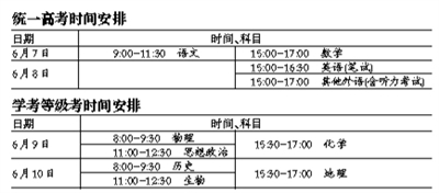 学考等级考科目为思想政治、历史、地理、物理、化学、生物6门,由考生自主选择3门参加考试,考试时间为6月9日至10日。