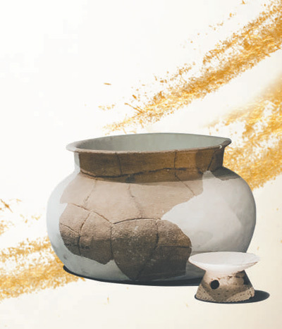 三星堆第三发掘区出土的陶高领瓮(后)和陶镂孔圈足盘。图为三星堆博物馆提供