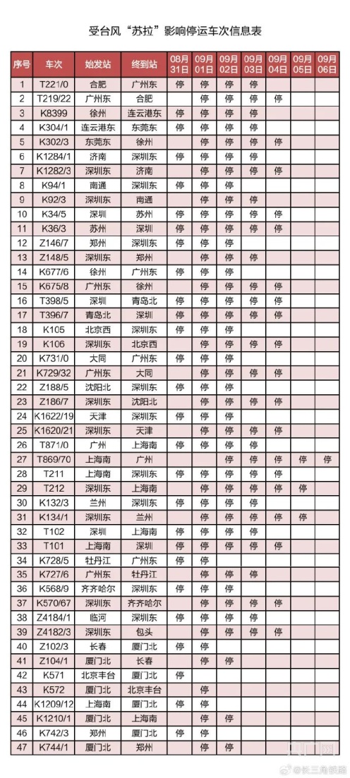 记者从中国铁路上海局集团有限公司获悉,受第9号台风“苏拉”影响,为确保列车运行安全,铁路部门计划对杭深线、京港高铁、广深城际、广深港高铁、穗深城际、京九线等线路运行的部分列车采取停运措施。截至30日17时30分,计划停运8月31日至9月6日间共121趟旅客列车:其中停运动车组列车74趟,停运普速列车47趟。