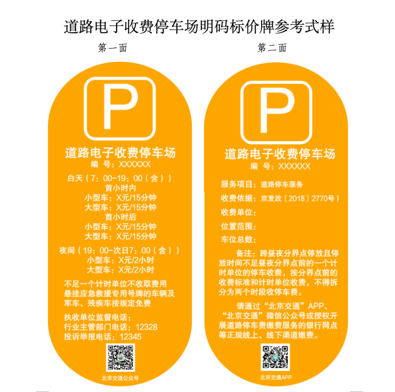 根据相关法规政策的新要求,按照依法合规、便民利民、不做大改的原则,征求意见稿对两种机动车停车场明码标价牌参考式样进行了修改完善,并附上“经营性机动车停车场明码标价牌参考式样”和“道路电子收费停车场明码标价牌参考式样”,供相关单位参照自行制作明码标价牌,明码标价牌编号为北京市公共停车场经营备案证的备案号。