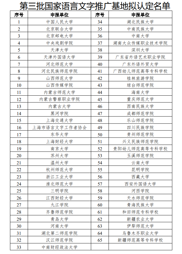 第三批国家语言文字推广基地拟认定名单公示