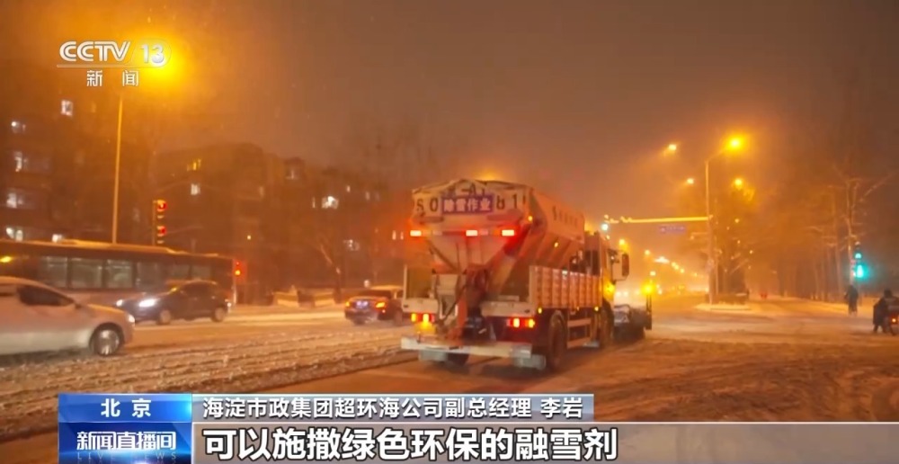 海淀市政集团超环海公司副总经理 李岩:通过人机配合的工作模式,缩短道路恢复的时间。大型的机械设备,主要是多功能除雪车,前面有滚刷,可以将雪打碎,后面有撒布设备,可以施撒绿色环保的融雪剂。