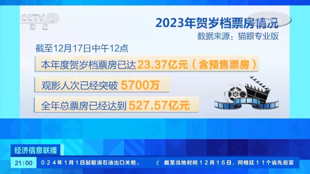 某电影数据平台显示,截至12月17日中午12点,本年度贺岁档票房已达23.37亿元(含预售票房),观影人次已经突破5700万,全年总票房已经达到527.57亿元。