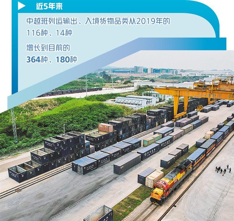 数据表明,高效、实惠、便捷的中越班列已得到市场认可。近5年来,中越班列运输出、入境货物品类从2019年的116种、14种,增长到目前的364种、180种。中越班列集货地已覆盖广西及周边省份20多个地市,跨境货物运输覆盖越南、老挝、泰国等多个东盟国家。