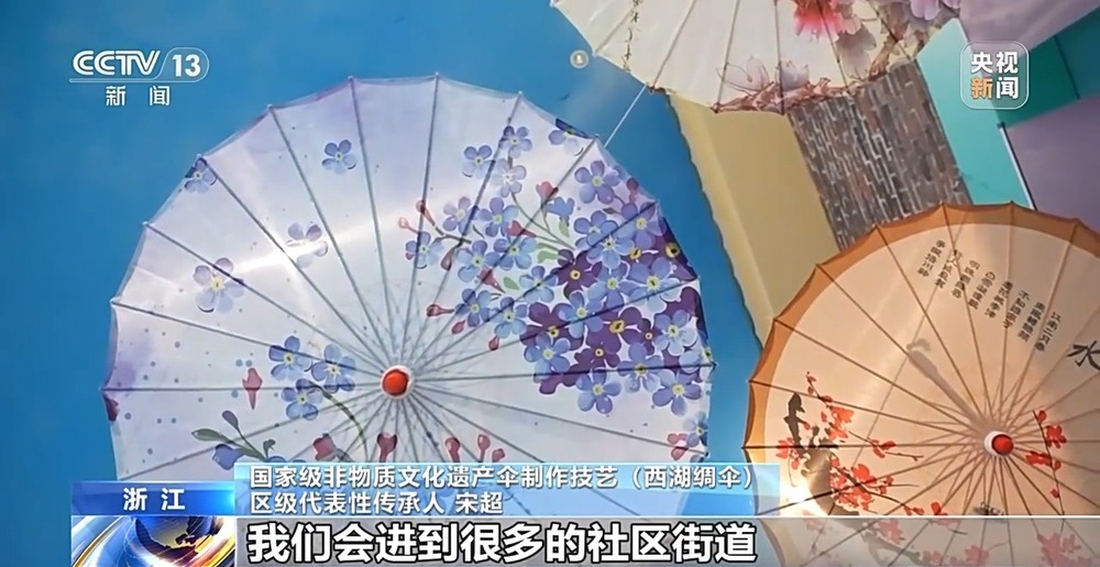 国家级非物质文化遗产伞制作技艺(西湖绸伞)区级代表性传承人 宋超:我们会进到很多的社区街道,我们会进到中小学的校园、博物馆、非遗展示馆等等这样的地方,去进行我们西湖绸伞技艺的展示展览,包括各种各样的体验活动,以此让更多人了解和认识到我们西湖绸伞这项技艺。