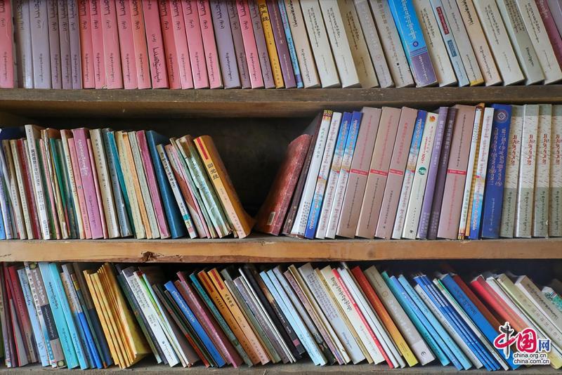 扎西达杰介绍藏书。中国网记者郑伟摄