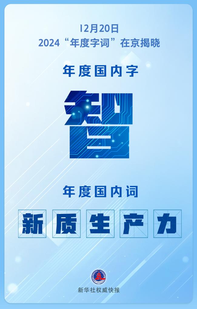 12月20日,“汉语盘点2024”活动在京揭晓“年度字词”——“智”“新质生产力”“变”“人工智能”分别当选2024年度国内字、国内词、国际字、国际词。