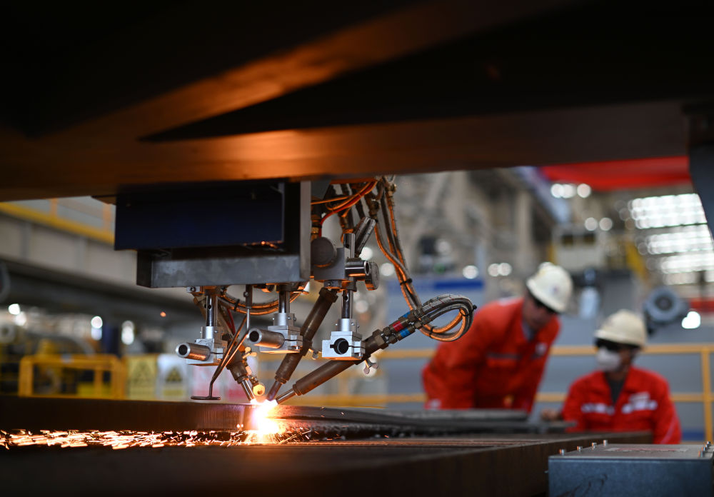 工作人员在海油工程天津智能制造基地制管作业车间调试数控切板机(2024年10月30日摄)。 新华社记者 赵子硕 摄