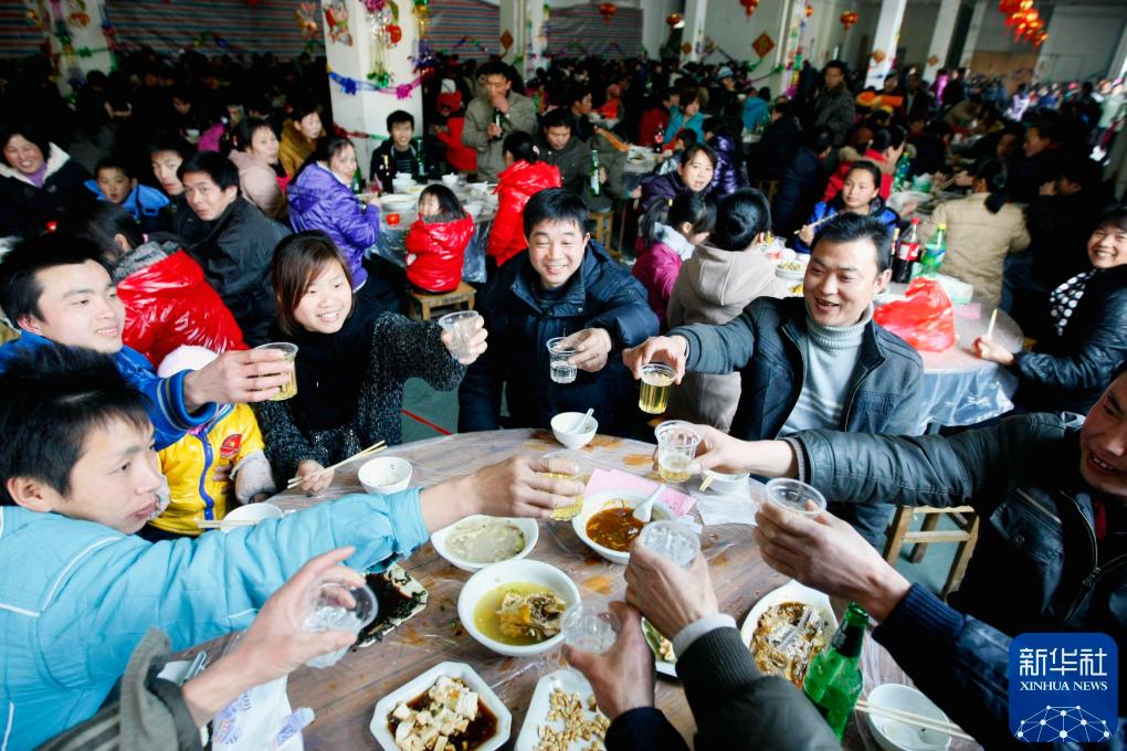 2011年2月2日,浙江诸暨一家公司准备了丰盛的年夜饭,招待800多名没有回家过年的员工及其家属,欢聚一堂共迎新年。新华社发(郭斌 摄)