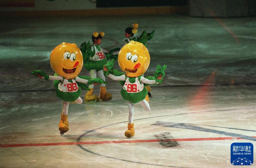 1996年2月4日,在哈尔滨举行的第三届亚冬会开幕式上,吉祥物豆豆伴随着活泼的儿歌,在冰上欢快地滑行。新华社记者 罗更前 摄
