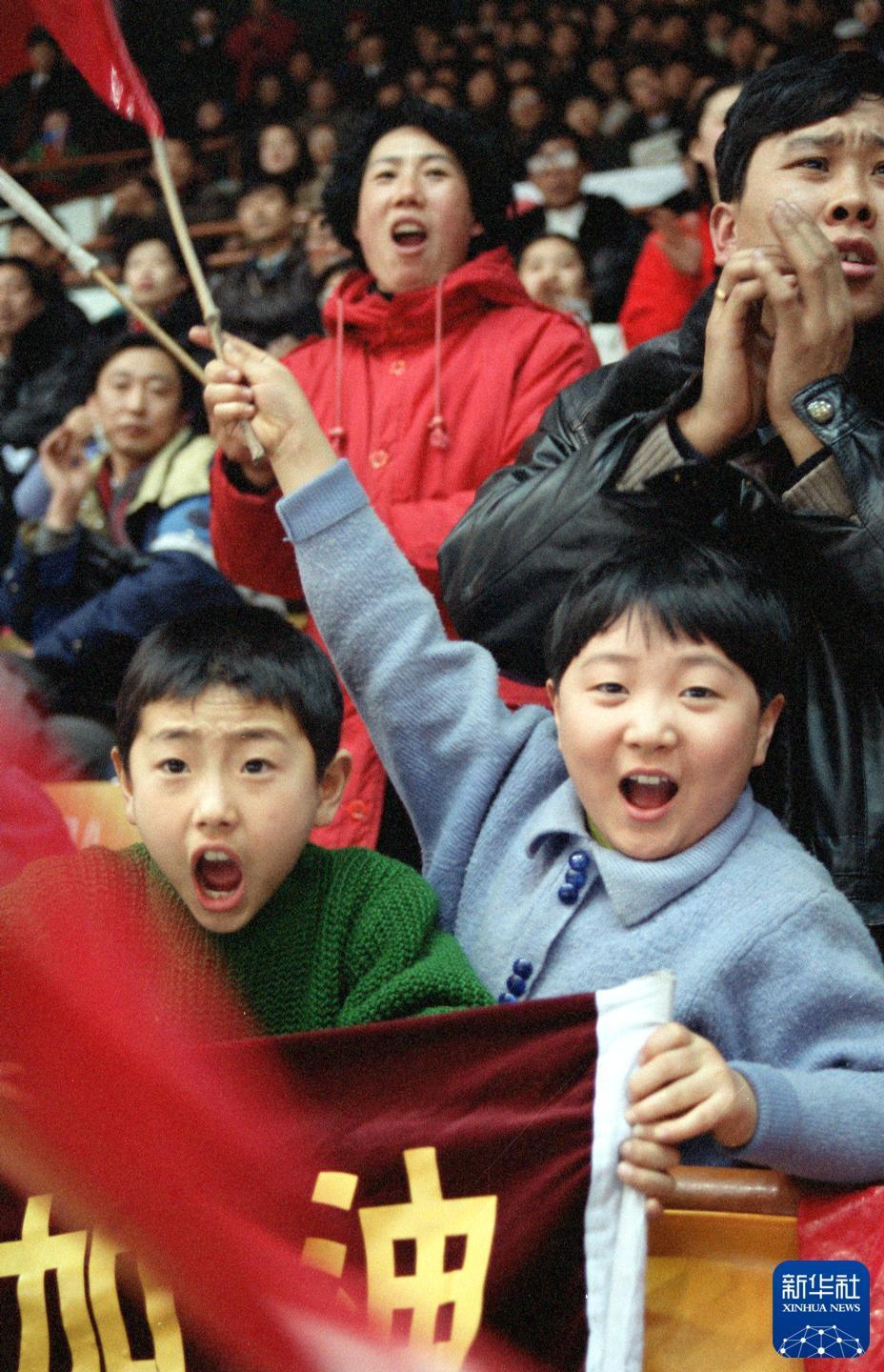 1996年2月6日,在第三届亚冬会女子短道速滑3000米接力赛中,观众摇旗呐喊,为参赛选手加油。新华社记者 官天一 摄