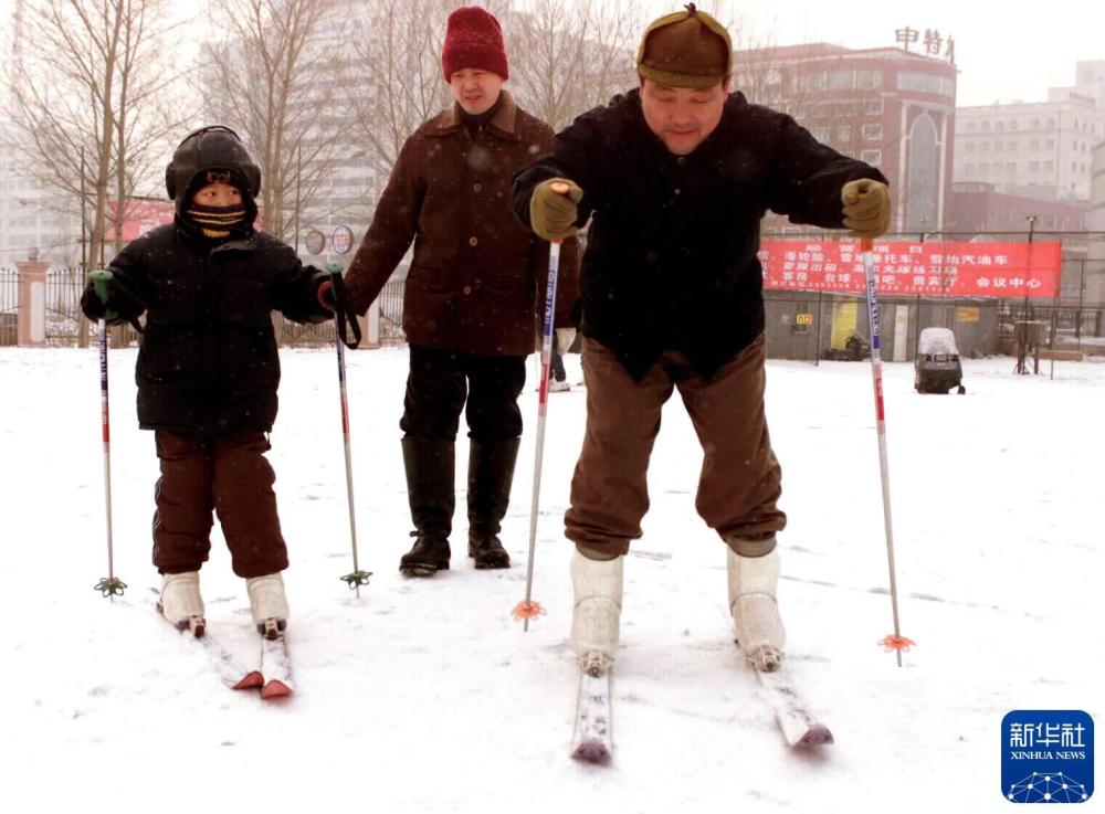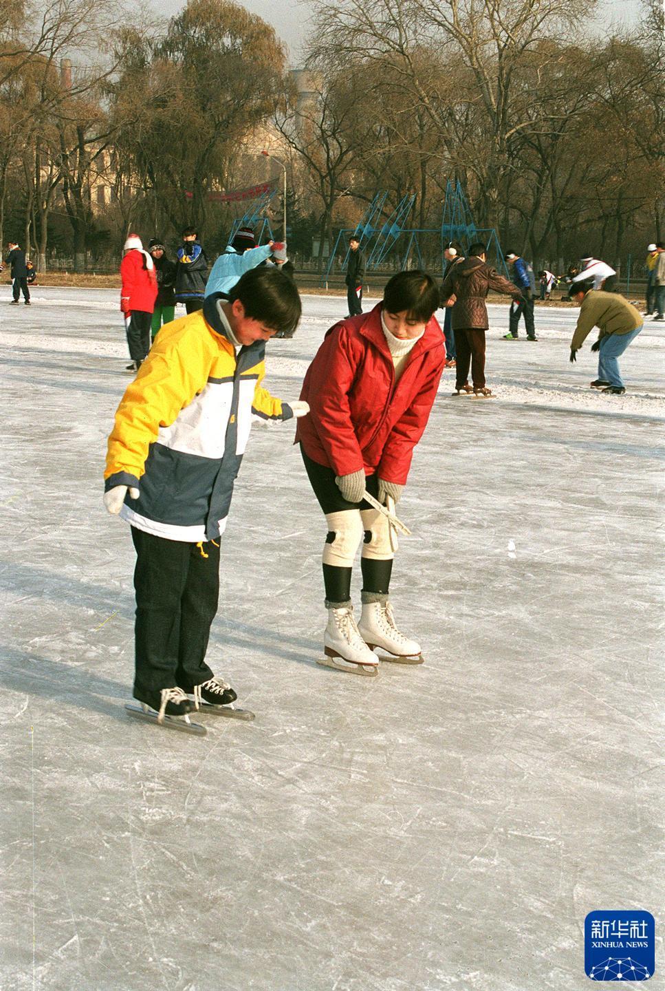 为普及冰雪运动,哈尔滨各学校陆续开设冰上课程。1998年,来自福建的哈尔滨理工大学新生晓莉(左)饶有兴趣地在冰上迈出蹒跚的第一步。新华社记者 崔峰 摄