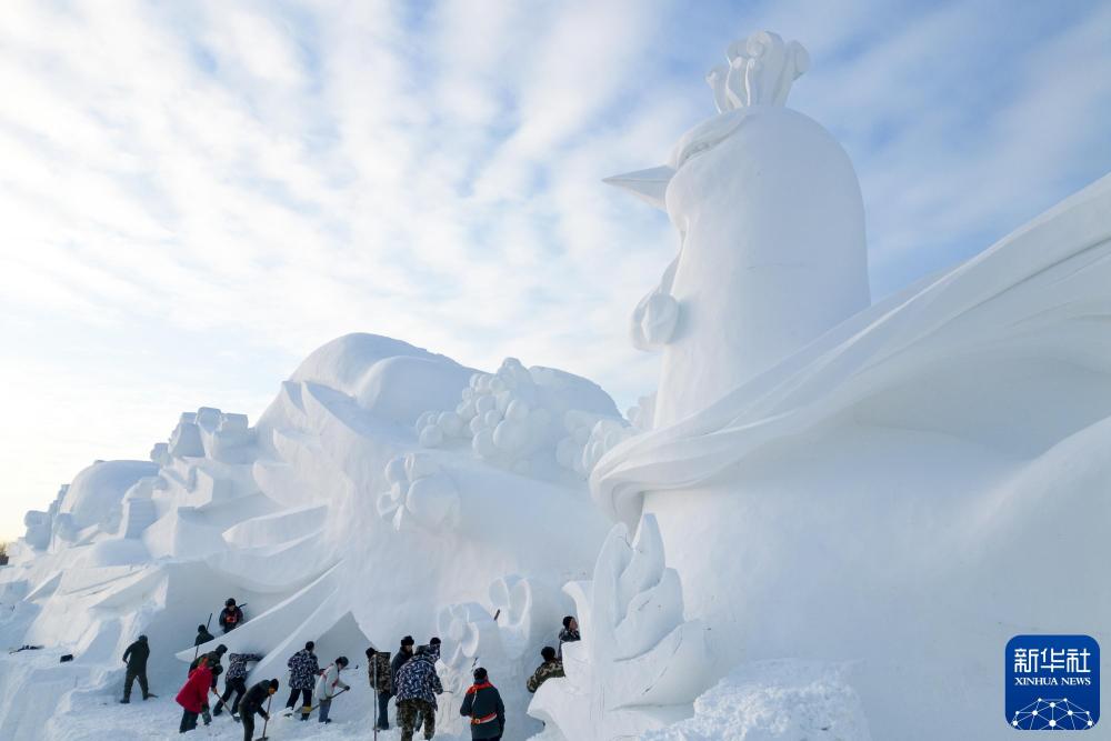 2024年12月23日,雕刻师在哈尔滨太阳岛雪博会园区创作大型雪雕。新华社记者 张涛 摄
