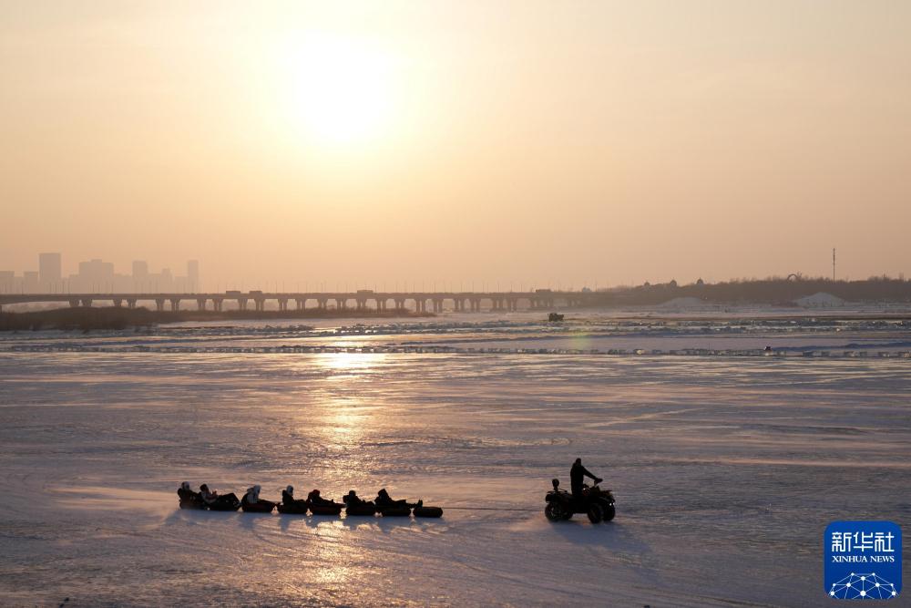 2024年2月12日,游客在哈尔滨松花江江面上体验冰雪娱乐项目。新华社记者 王建威 摄