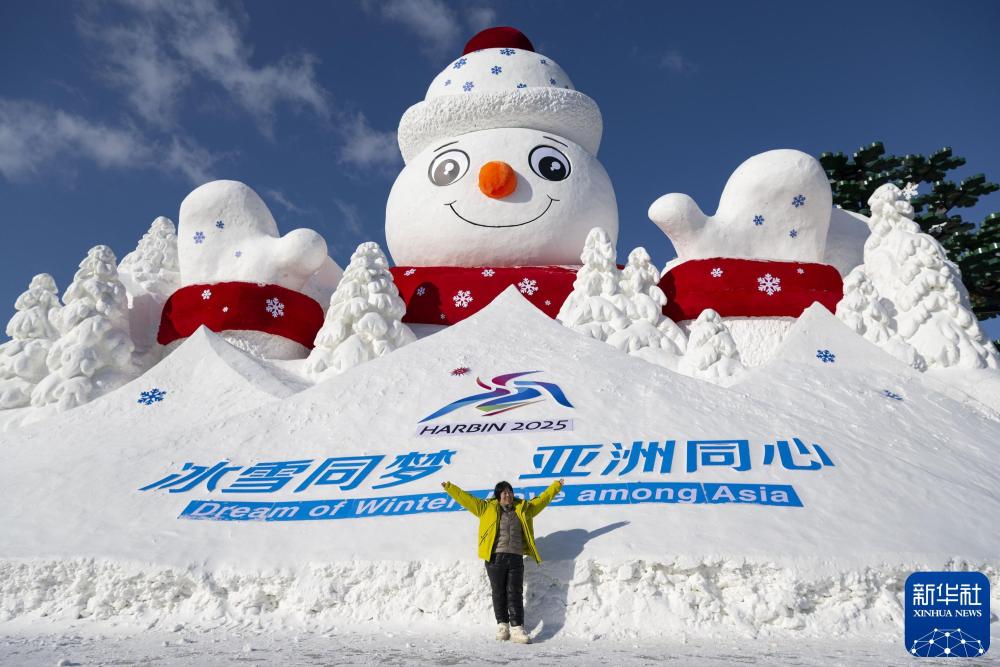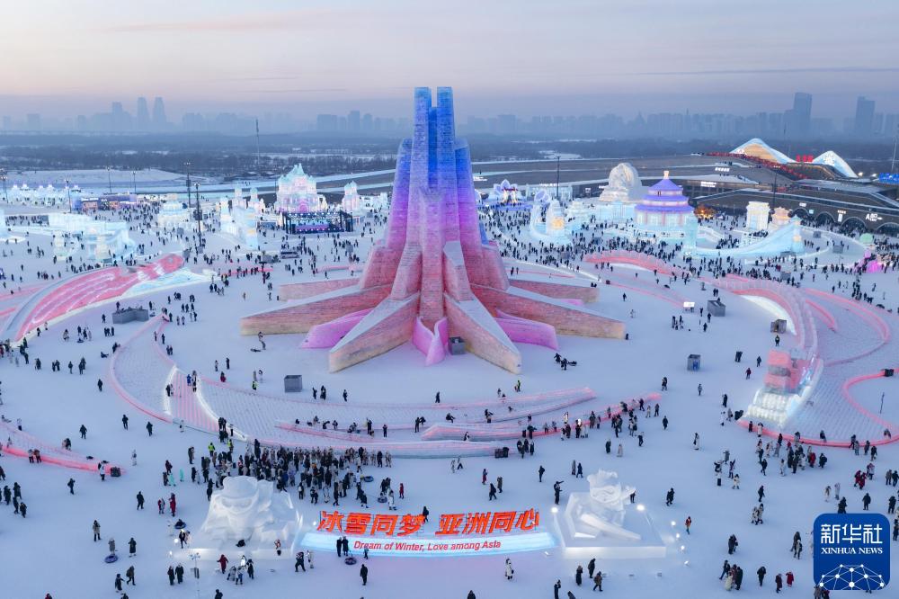 2025年1月5日,在哈尔滨冰雪大世界园区,游客在主塔“亚洲同心”附近游玩。新华社记者 谢剑飞 摄