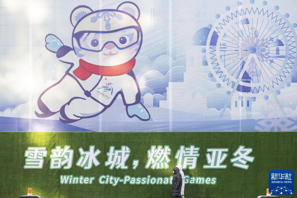 2025年1月8日,在哈尔滨道外区景阳街,人们走过巨幅亚冬会宣传画。新华社记者 谢剑飞 摄