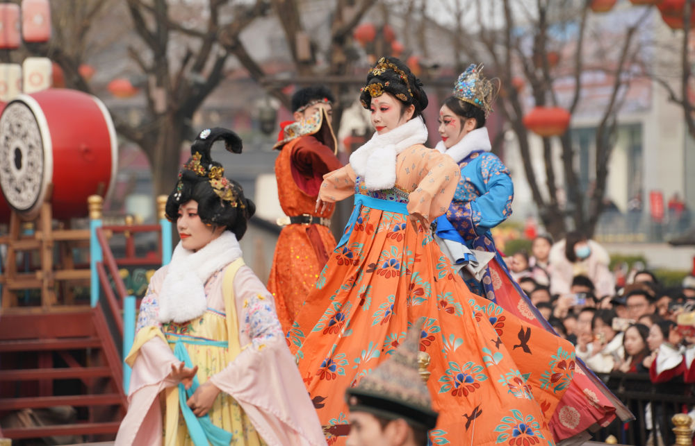 1月31日,游客在陕西西安大唐不夜城景区观看以唐代历史文化为背景创作的舞剧。新华社记者 邵瑞 摄