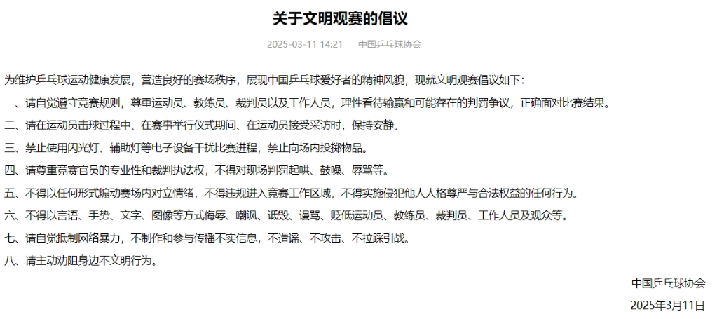 中国乒协表示,为维护乒乓球运动健康发展,营造良好的赛场秩序,展现中国乒乓球爱好者的精神风貌,特提出文明观赛的倡议。