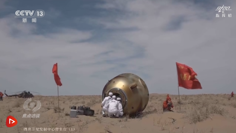 离地面最后一米,飞船返回舱反推发动机工作,返回舱稳稳落地。着陆场的搜救人员也很快到达了现场。
