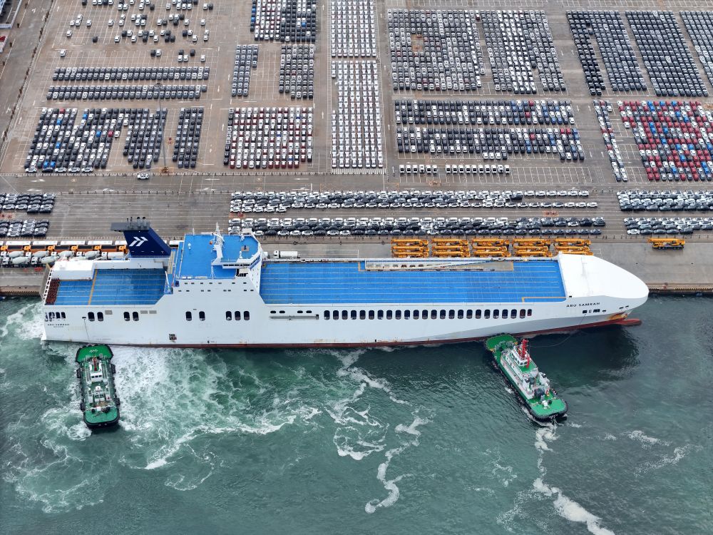 6月29日,汽车运输船停靠山东港口烟台港,准备装运出口汽车(无人机照片)。新华社发(唐克 摄)