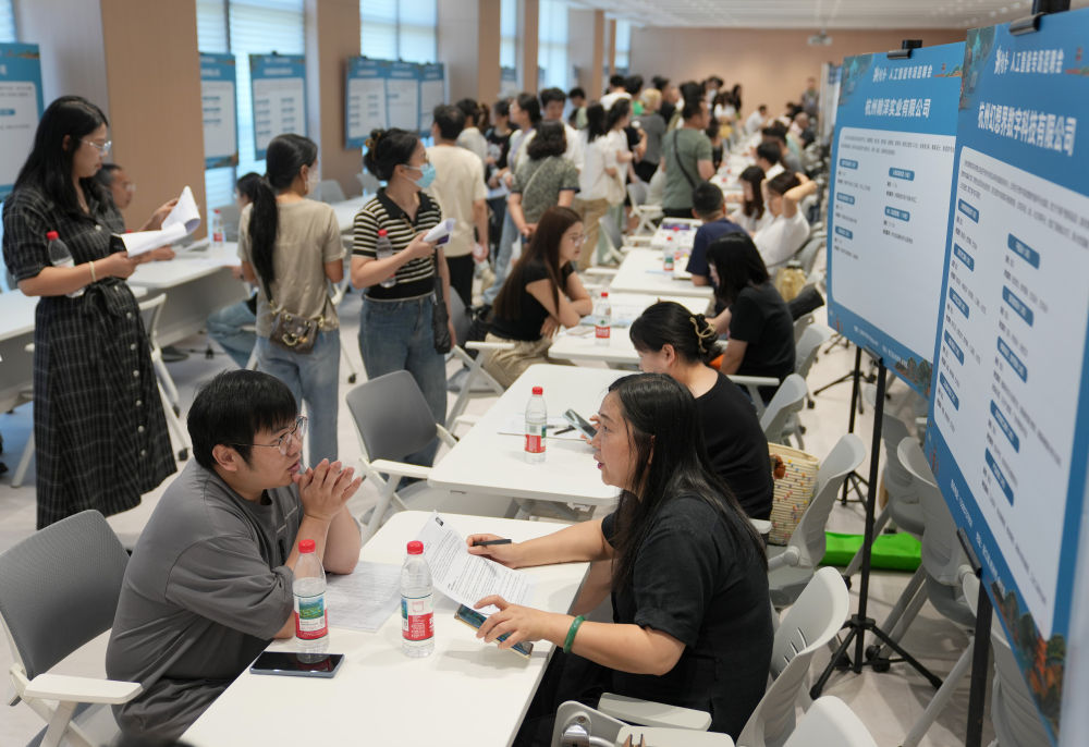 6月28日,求职者与招聘代表在2025年杭州市人工智能专场招聘会上洽谈。新华社记者 韩传号 摄