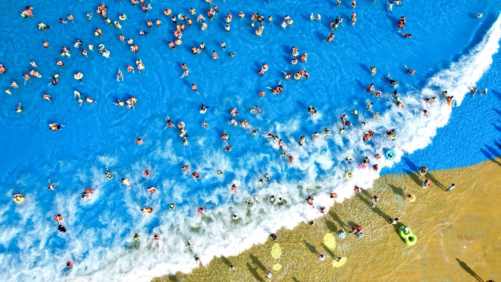 7月5日,浙江省湖州市长兴县太湖图影旅游度假区龙之梦乐园嬉水世界,游客亲水消暑(无人机照片)。新华社发(吴拯 摄)