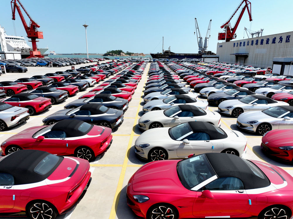 6月16日,在江苏省连云港港东方港务分公司码头,大批车辆等待装船外运(无人机照片)。新华社发(王春摄)