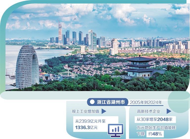 数据显示,2005年到2024年,湖州规上工业增加值从239.9亿元升至1336.3亿元,高新技术企业从30家增至2048家,万元地区生产总值能耗下降约48%。