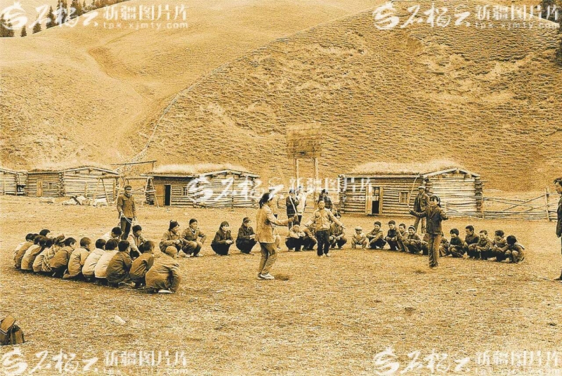 新疆图片库里,一张泛黄的老照片,生动再现了乌鲁木齐县水西沟镇庙尔沟中学的“孩提”时光:光秃秃的大山脚下,几座松木搭建起来的简易房屋,矮趴趴“长”在草场上。远处空地上,一群学生们蹲在地上围成圈,正在观看几个同学进行跳绳比赛。
