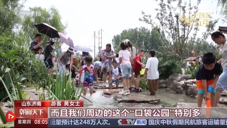 游客黄女士说,山更青了、水更美了,祖国处处的山水都很美。周边的口袋公园特别多,方便他们锻炼身体对老年人很有帮助。