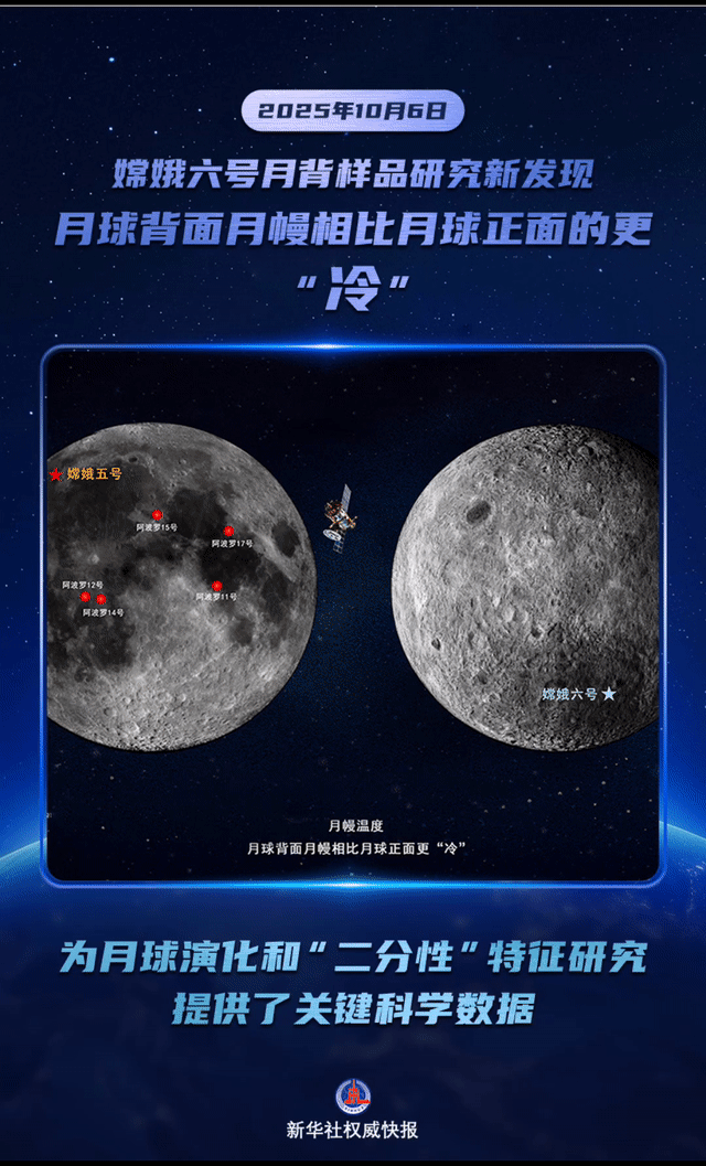 10月6日,国家航天局和国家原子能机构联合发布嫦娥六号月球背面样品研究最新成果。我国科学家首次基于嫦娥六号月球背面样品(月壤)研究发现,月球背面月幔相比月球正面的更“冷”,进一步深化了人类对月球“二分性”现象的认识,为月球正面与月球背面的月幔温度差异提供了岩石学与地球化学等科学依据,为月球演化和“二分性”特征研究提供了科学数据。