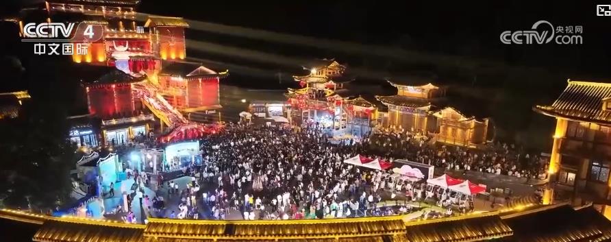 夜幕降临,重庆市酉阳土家族苗族自治县的桃花源景区灯火璀璨,游人如织。古朴的吊脚楼缀满灯光,游客们或漫步在青石板街欣赏夜景,或围成圆圈跳起舞蹈,现场欢声笑语不断。随着杂技、川剧变脸等节目上演,现场气氛逐渐升温。演员们不时走入观众席与游客互动,将中秋的氛围推向高潮。
