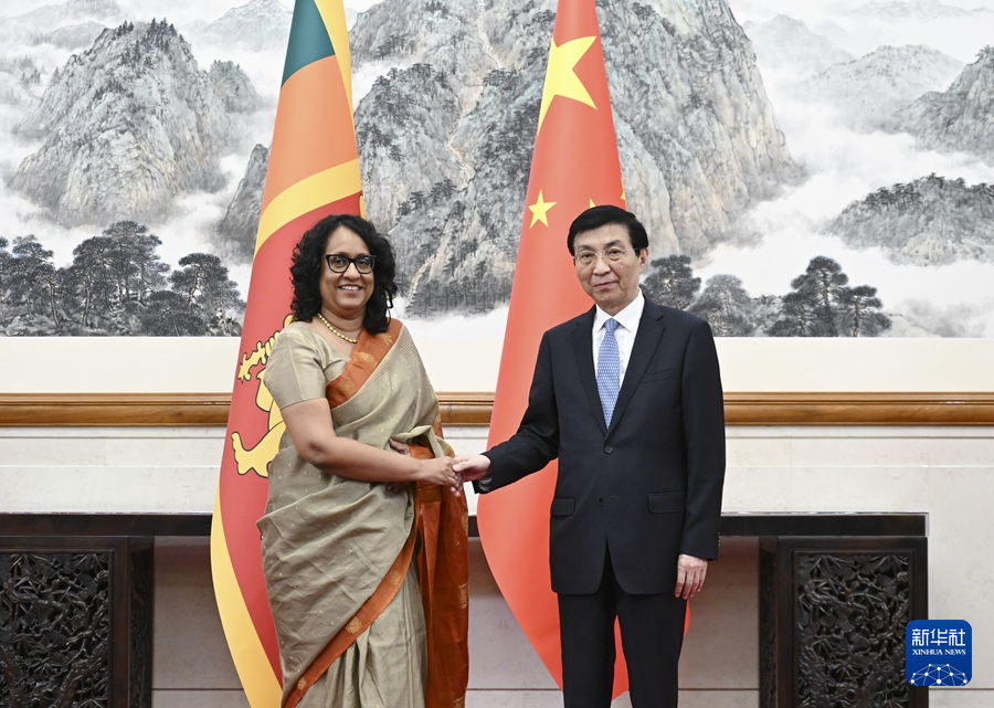 全国政协主席王沪宁13日在京会见来华出席全球妇女峰会的斯里兰卡总理阿马拉苏里亚。