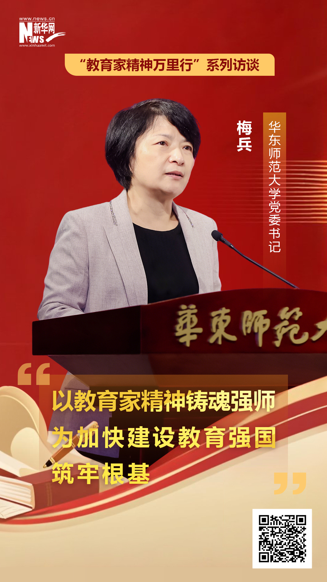 近日,华东师范大学党委书记梅兵接受新华网专访时,系统阐释了实施教育家精神铸魂强师行动对高校教师的新要求、学校弘扬教育家精神的创新举措,以及高校筑牢教育家精神践行主阵地、深化教师管理评价改革的路径方向,为教育强国建设背景下的教师队伍建设提供思路。