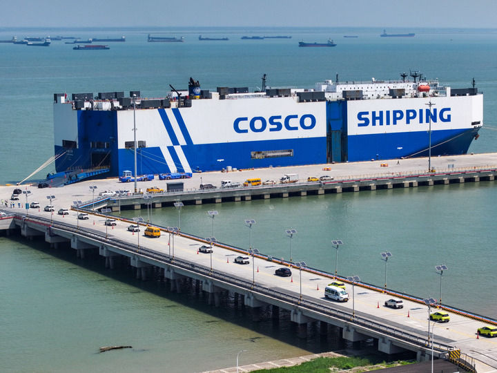 江苏太仓港,“礼诺运输”号货轮载着2600余辆汽车奔赴欧洲,“玉衡先锋”号货轮正将3600多辆国产新车运往东南亚。