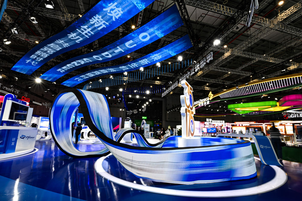这是2024年11月8日在第七届进博会医疗器械及医药保健展区拍摄的辉瑞展台。新华社记者 辛悦卫 摄