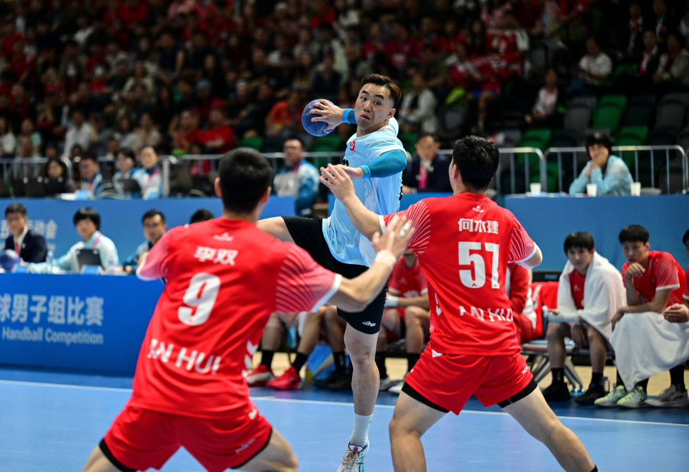 11月8日,在香港进行的第十五届全国运动会男子手球半决赛中,香港队球员连润滔(中)在比赛中射门。新华社记者 于洋 摄