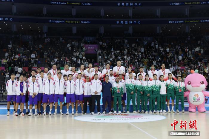 11月12日晚,第十五届全国运动会篮球项目男子成年组金牌赛在东莞篮球中心举行,广东队101比65战胜浙江队夺得金牌。图为颁奖仪式后,广东队、香港队、澳门队合影。中新社记者 盛佳鹏 摄