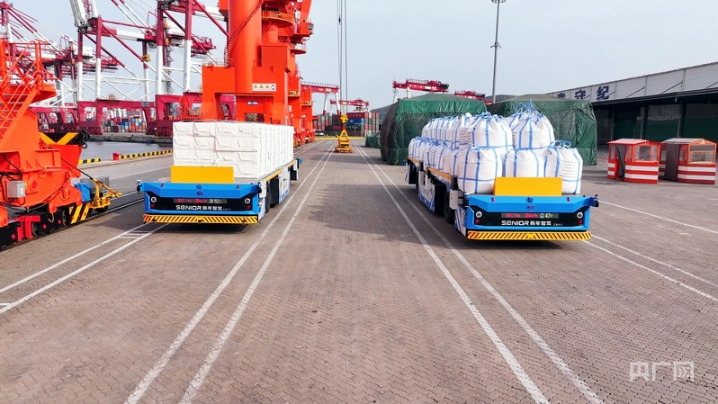 智能引导运输车装载货物在码头穿梭(央广网记者 唐磊 摄)