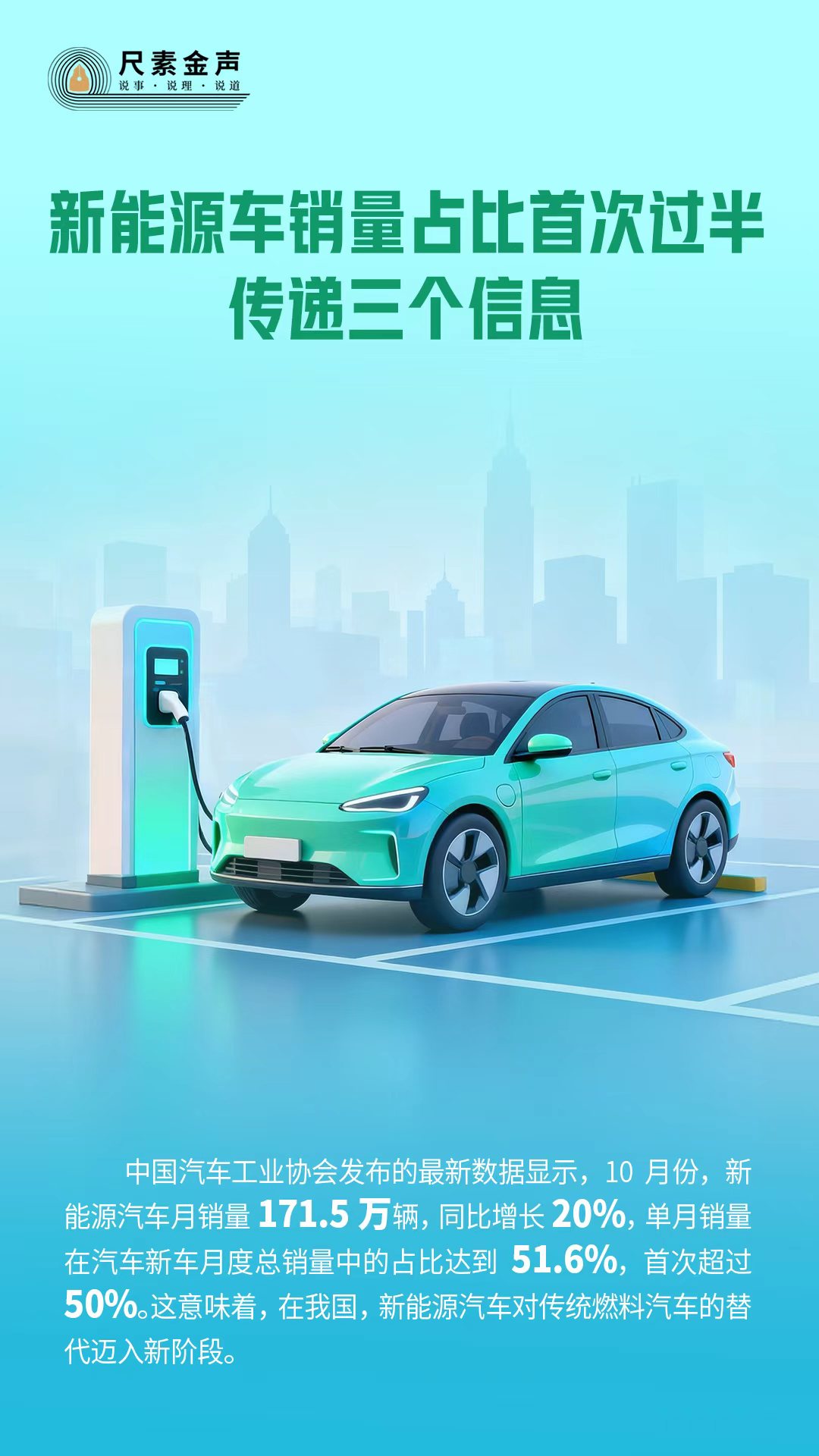 中国汽车工业协会发布的最新数据显示,10月份,新能源汽车月销量171.5万辆,同比增长20%,单月销量在汽车新车月度总销量中的占比达到51.6%,首次超过50%。这意味着,在我国,新能源汽车对传统燃料汽车的替代迈入新阶段。