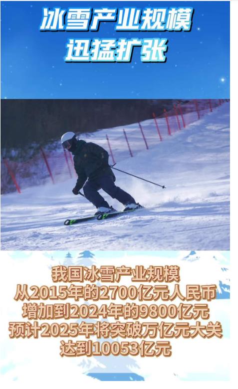 我国冰雪产业规模从2015年的2700亿元人民币增加到2024年的9800亿元,预计2025年将突破万亿元大关,达到10053亿元。